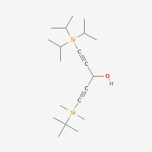 The mechanism of action of 1-(tert-Butyldimethylsilyl)-5-(triisopropylsilyl)-1,4-pentadiyn-3-ol primarily involves its role as a protecting group. The silyl groups protect the hydroxyl group from unwanted reactions during synthetic procedures. The compound’s stability under various conditions allows for selective reactions at other sites of the molecule. The deprotection step, where the silyl groups are removed, is typically the final step in the synthesis, revealing the free hydroxyl group for further functionalization .
