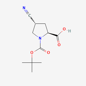 The mechanism of action of (2S,4R)-1-(tert-butoxycarbonyl)-4-cyanopyrrolidine-2-carboxylic acid involves its interaction with specific molecular targets, such as enzymes or receptors. The Boc protecting group can be selectively removed to expose the active amine, which can then participate in binding or catalytic processes. The cyanopyrrolidine moiety may interact with active sites of enzymes, inhibiting their activity or modulating their function .
