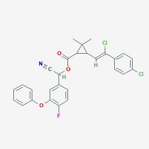 This compound is a complex synthetic pyrethroid characterized by its alpha-cyano group and a di-substituted vinylcyclopropane carboxylic acid ester structure. Its synthesis involves a multi-step process, beginning with the preparation of two key intermediates: 3-(2-chloro-2-(4-chlorophenyl)vinyl)-2,2-dimethylcyclopropane-carboxylic acid and 4-fluoro-3-phenoxybenzaldehyde. These intermediates are then coupled to form the final this compound molecule.