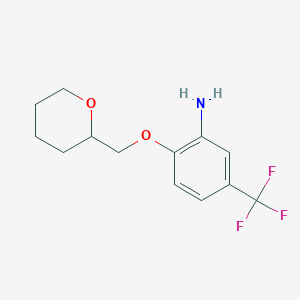2-(Tetrahydro-2H-pyran-2-ylmethoxy)-5-(trifluoromethyl)aniline is a substituted aniline derivative featuring a trifluoromethyl group at the 5-position and a tetrahydro-2H-pyran-2-ylmethoxy (THP-methoxy) group at the 2-position of the aromatic ring. The THP moiety is a cyclic ether that enhances solubility and stability, while the electron-withdrawing trifluoromethyl group modulates electronic properties and biological activity. This compound is primarily utilized as an intermediate in pharmaceutical synthesis, with two commercial suppliers identified .
