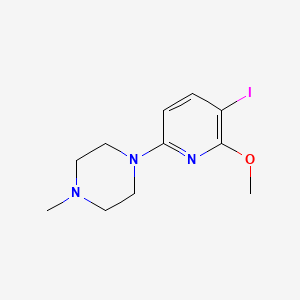 1-(5-Iodo-6-methoxypyridin-2-yl)-4-methylpiperazine is a synthetic organic compound belonging to the piperazine family, characterized by its unique structural features including a pyridine ring with iodine and methoxy substituents. This compound has garnered attention for its potential biological activities, particularly in medicinal chemistry and pharmacology.