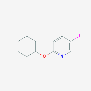The mechanism of action of 2-Cyclohexyloxy-5-iodopyridine involves its ability to participate in various chemical reactions, particularly those involving the formation and breaking of carbon-carbon and carbon-heteroatom bonds. The presence of the iodine atom makes it a good leaving group, facilitating substitution and coupling reactions. The cyclohexyloxy group can also influence the compound’s reactivity and interactions with other molecules .