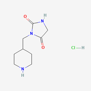 This compound (CAS: 1351647-38-5) is a nitrogen-containing heterocyclic compound with the molecular formula C₉H₁₆ClN₃O₂ and a molecular weight of 233.69 g/mol . Its structure comprises an imidazolidine-2,4-dione core (a five-membered ring with two carbonyl groups and two nitrogen atoms) linked via a methylene bridge to a piperidine ring at the 4-position (Figure 1). The hydrochloride salt enhances aqueous solubility, making it suitable for synthetic and pharmacological applications.