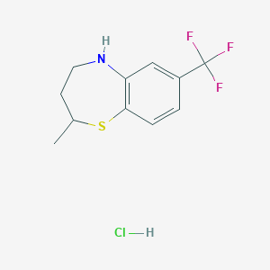 2-Methyl-7-(trifluoromethyl)-2,3,4,5-tetrahydro-1,5-benzothiazepine hydrochloride is a fluorinated benzothiazepine derivative. Benzothiazepines are heterocyclic compounds featuring a seven-membered ring containing sulfur and nitrogen atoms. The trifluoromethyl (-CF₃) substitution at the 7-position and a methyl group at the 2-position distinguish this compound from simpler benzothiazepines. Its hydrochloride salt form enhances solubility, a critical factor for bioavailability in pharmaceutical applications .