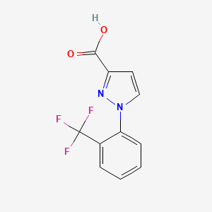 The mechanism of action of 1-[2-(trifluoromethyl)phenyl]-1H-pyrazole-3-carboxylic acid involves its interaction with specific molecular targets and pathways. For example, in biological systems, the compound may inhibit certain enzymes or receptors, leading to its observed biological effects . The trifluoromethyl group plays a crucial role in enhancing the compound’s binding affinity and selectivity towards its targets .