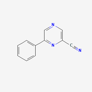 Key steps include selective substitution reactions on the pyrazine ring, introduction of the phenyl group (often via cross-coupling reactions such as Suzuki or Stille coupling), and installation of the nitrile group through functional group transformations such as dehydration of amides or halide displacement by cyanide.