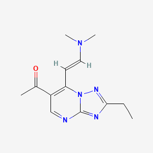 The specific compound 1-{7-[(E)-2-(dimethylamino)vinyl]-2-ethyltriazolo[1,5-a]pyrimidin-6-yl}ethanone represents an advanced example of structural modification within this chemical class. With a molecular formula of C₁₃H₁₇N₅O and a molecular weight of 259.31 g/mol, this compound incorporates multiple functional elements that enhance its pharmacological potential. The presence of the dimethylamino vinyl group introduces both electronic and steric effects that can significantly influence biological activity, while the ethyl substituent and acetyl functionality provide additional sites for molecular recognition.