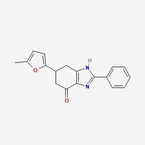 The incorporation of furan moieties into benzimidazole scaffolds introduces additional layers of structural complexity and functional diversity that significantly impact biological activity. The compound 6-(5-methyl-2-furyl)-2-phenyl-1,5,6,7-tetrahydro-4H-benzimidazol-4-one exemplifies this strategic combination, featuring a furan ring system that contributes both electronic and steric properties to the overall molecular architecture. The furan ring, being a five-membered oxygen-containing heterocycle, provides unique electronic characteristics due to the presence of the oxygen atom, which can participate in hydrogen bonding interactions and influence the overall electronic distribution of the molecule. The methyl substitution at the 5-position of the furan ring further modifies the electronic properties and potentially enhances metabolic stability by providing steric protection against enzymatic degradation.