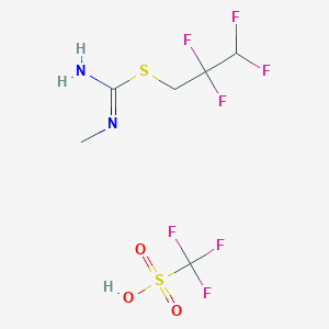 N'-Methyl[(2,2,3,3-tetrafluoropropyl)sulfanyl]methanimidamide; trifluoromethanesulfonic acid is a bifunctional compound comprising two distinct moieties: a sulfanyl methanimidamide derivative and a trifluoromethanesulfonic acid counterion. The molecular formula is C₆H₉F₇N₂O₃S₂ , with a molecular weight of 354.3 g/mol . The core structure features: