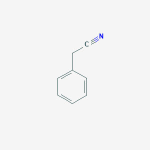 Phenylacetonitrile, also commonly known as benzyl (B1604629) cyanide, is a versatile organic compound that serves as a crucial intermediate in the synthesis of a wide array of chemical products, ranging from pharmaceuticals and agrochemicals to fragrances and dyes. Its unique molecular structure, featuring a reactive nitrile group and an acidic methylene (B1212753) bridge adjacent to a phenyl ring, imparts a rich and varied chemical reactivity. This technical guide provides a comprehensive overview of the fundamental properties of this compound, its characteristic reactions, and detailed experimental protocols for its key transformations. This document is intended to be a valuable resource for researchers, chemists, and professionals involved in drug development and chemical synthesis.