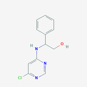 2-((6-Chloropyrimidin-4-yl)amino)-2-phenylethan-1-ol is a chiral amino alcohol derivative featuring a pyrimidine ring substituted at the 6-position with chlorine. This compound is structurally characterized by a phenylethanol backbone linked to a 6-chloropyrimidine moiety via an amino group. Its molecular formula is C₁₂H₁₂ClN₃O (MW: 249.69 g/mol), and it serves as a key intermediate in medicinal chemistry, particularly in the synthesis of kinase inhibitors targeting receptors like EGFR .