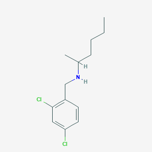 (2,4-Dichlorophenyl)methylamine is a secondary amine characterized by a 2,4-dichlorobenzyl group attached to a hexan-2-ylamine moiety. The 2,4-dichlorophenyl substituent is a common pharmacophore in agrochemicals and pharmaceuticals due to its electron-withdrawing properties and ability to enhance lipophilicity, which can improve membrane permeability .