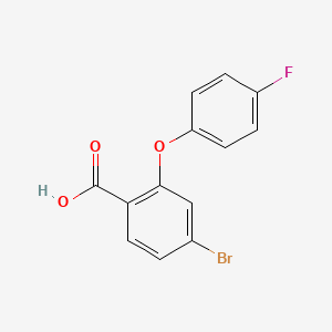 4-Bromo-2-(4-fluorophenoxy)benzoic acid is a halogenated benzoic acid derivative featuring a bromine atom at the para position (C4) and a 4-fluorophenoxy group at the ortho position (C2) on the aromatic ring. This compound is of interest in organic synthesis, material science, and pharmaceutical research due to its unique electronic and steric properties. The bromine atom acts as a strong electron-withdrawing group (EWG), while the 4-fluorophenoxy group introduces additional steric bulk and moderate electron withdrawal.