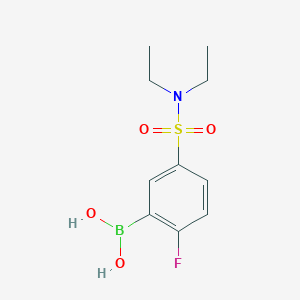 (5-(N,N-Diethylsulfamoyl)-2-fluorophenyl)boronic acid is a specialized boronic acid derivative characterized by a 2-fluorophenyl core substituted with a diethylsulfamoyl group at the 5-position. This compound is pivotal in Suzuki-Miyaura cross-coupling reactions, a cornerstone methodology in medicinal chemistry for constructing biaryl and heteroaryl scaffolds . Its diethylsulfamoyl moiety enhances solubility in organic solvents and modulates electronic properties, making it advantageous in synthesizing bioactive molecules, particularly in pharmaceutical and agrochemical research . The CAS number 1704095-35-1 (for its methoxy analog) and related derivatives (e.g., 1704066-89-6) highlight its structural versatility .