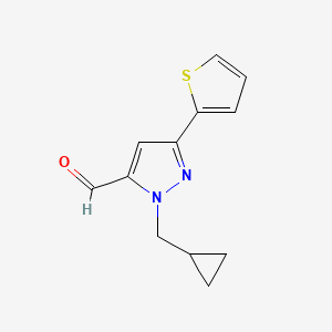 1-(Cyclopropylmethyl)-3-(thiophen-2-yl)-1H-pyrazole-5-carbaldehyde is a heterocyclic compound that has garnered attention in medicinal chemistry due to its unique structural features and potential biological activities. This compound combines a pyrazole ring with a cyclopropylmethyl group and a thiophen-2-yl substituent, which may influence its interaction with biological targets.