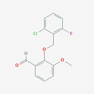 The mechanism of action of 2-[(2-Chloro-6-fluorobenzyl)oxy]-3-methoxybenzaldehyde is not well-documented. its effects are likely mediated through interactions with specific molecular targets, such as enzymes or receptors, leading to changes in biochemical pathways. The presence of the chloro and fluoro substituents may enhance its binding affinity and specificity for certain targets .