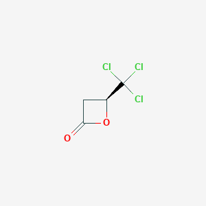 (S)-4-Trichloromethyl-2-oxetanone is a chiral β-lactone (four-membered cyclic ester) characterized by a trichloromethyl substituent at the 4-position of the oxetanone ring. Its molecular formula is C₄H₃Cl₃O₂, with a molecular weight of 189.416 g/mol . This compound serves as a versatile synthon in asymmetric synthesis, particularly for producing γ-substituted α-amino acids and their precursors. For example, it has been utilized in the concise synthesis of protected homoserine equivalents and naturally occurring amino acids, such as those isolated from Blighia unijugata seeds . The (S)-configuration at the stereocenter is critical for enantioselective applications, enabling precise control over stereochemical outcomes in organic transformations.