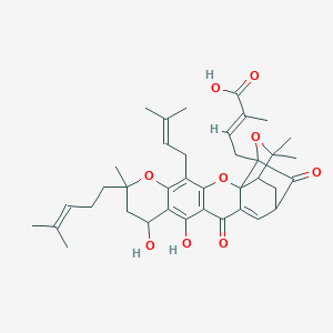InChI=1S/C38H46O9/c1-19(2)10-9-14-36(8)18-25(39)27-30(41)28-29(40)24-16-22-17-26-35(6,7)47-37(33(22)42,15-13-21(5)34(43)44)38(24,26)46-32(28)23(31(27)45-36)12-11-20(3)4/h10-11,13,16,22,25-26,39,41H,9,12,14-15,17-18H2,1-8H3,(H,43,44)/b21-13+ | |