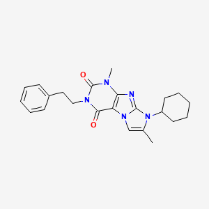8-Cyclohexyl-1,7-dimethyl-3-phenethyl-1H-imidazo[2,1-f]purine-2,4(3H,8H)-dione is a complex organic compound belonging to the class of imidazo[2,1-f]purines. This compound is characterized by its unique structure, which includes a cyclohexyl group, two methyl groups, a phenethyl group, and an imidazo[2,1-f]purine core. It is of significant interest in the fields of medicinal chemistry and pharmacology due to its potential biological activities.