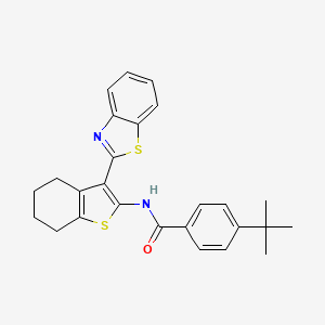 N-[3-(1,3-benzothiazol-2-yl)-4,5,6,7-tetrahydro-1-benzothiophen-2-yl]-4-tert-butylbenzamide is a heterocyclic compound featuring a benzothiazole moiety fused to a tetrahydrobenzothiophene core, with a 4-tert-butylbenzamide substituent.
