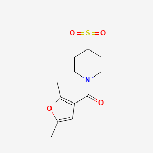 The mechanism of action of (2,5-Dimethylfuran-3-yl)(4-(methylsulfonyl)piperidin-1-yl)methanone involves its interaction with specific molecular targets and pathways. The compound may act as an inhibitor or activator of certain enzymes or receptors, depending on its structural features and the context of its use. Detailed studies are required to elucidate the exact molecular targets and pathways involved.