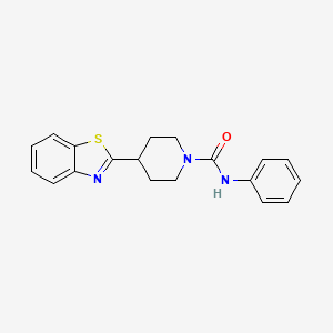 4-(1,3-Benzothiazol-2-yl)-N-phenylpiperidine-1-carboxamide undergoes various chemical reactions, including oxidation, reduction, and substitution reactions. Common reagents used in these reactions include oxidizing agents like potassium permanganate, reducing agents such as sodium borohydride, and nucleophiles for substitution reactions . The major products formed from these reactions depend on the specific conditions and reagents used. For example, oxidation may yield sulfoxides or sulfones, while reduction can produce amines or alcohols .