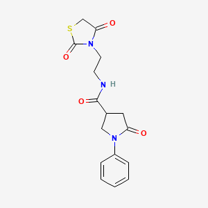 N-[2-(2,4-dioxo-1,3-thiazolidin-3-yl)ethyl]-5-oxo-1-phenylpyrrolidine-3-carboxamide is a synthetic compound featuring a pyrrolidine-3-carboxamide core linked to a 2,4-dioxo-thiazolidine moiety via an ethyl chain. This structure combines two pharmacologically relevant heterocycles: the pyrrolidine ring, often associated with conformational flexibility in drug design, and the thiazolidinone scaffold, known for its role in modulating enzyme activity (e.g., MMP inhibition ).
