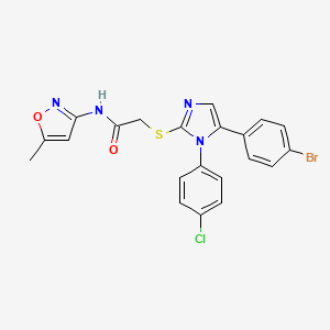 This compound is a hybrid heterocyclic molecule featuring a 1,3-disubstituted imidazole core with a 4-bromophenyl group at position 5 and a 4-chlorophenyl group at position 1. The imidazole ring is linked via a thioether bridge to an acetamide moiety, which is further substituted with a 5-methylisoxazole group. Its molecular formula is C₂₀H₁₅BrClN₃O₂S, with an average molecular weight of 485.78 g/mol and a ChemSpider ID of 851079-28-2 .