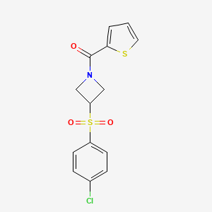 The mechanism of action of (3-((4-Chlorophenyl)sulfonyl)azetidin-1-yl)(thiophen-2-yl)methanone involves its interaction with specific molecular targets. These interactions can modulate various biochemical pathways, leading to the compound’s observed effects. The exact molecular targets and pathways involved depend on the specific application and context of use.
