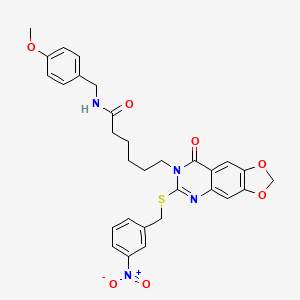 This compound is a quinazoline derivative characterized by a [1,3]dioxolo[4,5-g]quinazolin-8-one core substituted with a hexanamide chain, a 3-nitrophenylsulfanyl group at position 6, and a 4-methoxybenzyl moiety at the terminal amide. Its molecular formula is C₃₀H₃₀N₄O₇S (molecular weight: ~590.65 g/mol), with key structural features including a sulfanyl bridge, nitro group, and methoxy-substituted aromatic rings.