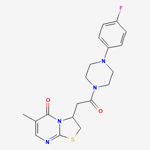 This compound is a heterocyclic molecule featuring a thiazolo[3,2-a]pyrimidin-5(3H)-one core substituted with a 4-fluorophenylpiperazine moiety via a 2-oxoethyl linker and a methyl group at the 6-position. The 4-fluorophenyl group may enhance binding affinity to serotonin or dopamine receptors, while the thiazolo-pyrimidinone scaffold could influence metabolic stability .