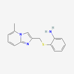 The mechanism of action of 2-(5-Methyl-imidazo[1,2-a]pyridin-2-ylmethylsulfanyl)-phenylamine involves its interaction with specific molecular targets, such as enzymes or receptors. The compound can inhibit enzyme activity by binding to the active site, thereby blocking substrate access. This interaction can modulate various biochemical pathways, leading to its observed biological effects .