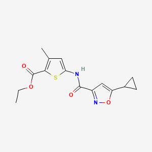 Ethyl 5-(5-cyclopropylisoxazole-3-carboxamido)-3-methylthiophene-2-carboxylate is a complex organic compound that belongs to the class of isoxazole derivatives. Isoxazoles are five-membered heterocyclic compounds containing one oxygen and one nitrogen atom at adjacent positions.