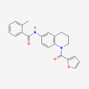 N-[1-(furan-2-carbonyl)-1,2,3,4-tetrahydroquinolin-6-yl]-2-methylbenzamide is a complex organic compound that has garnered attention in medicinal chemistry due to its unique structural features and potential biological activities. This compound is characterized by the presence of a furan-2-carbonyl moiety linked to a tetrahydroquinoline structure, which is further connected to a methylbenzamide group. The combination of these functional groups suggests diverse interactions with biological targets.
