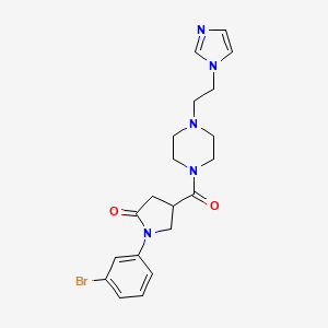 The compound 4-(4-(2-(1H-imidazol-1-yl)ethyl)piperazine-1-carbonyl)-1-(3-bromophenyl)pyrrolidin-2-one is a synthetic organic molecule that has garnered attention for its potential biological activities. This article explores its pharmacological properties, mechanisms of action, and relevant case studies.
