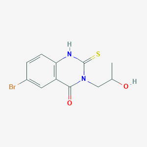 The mechanism of action of 6-Bromo-3-(2-hydroxypropyl)-2-sulfanyl-3,4-dihydroquinazolin-4-one involves its interaction with specific molecular targets and pathways. The bromine atom and sulfanyl group may play crucial roles in binding to target proteins or enzymes, thereby modulating their activity. The hydroxypropyl group may enhance the compound’s solubility and bioavailability, facilitating its cellular uptake and distribution.
