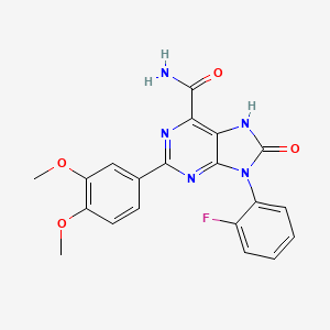 The synthesis of 2-(3,4-dimethoxyphenyl)-9-(2-fluorophenyl)-8-oxo-8,9-dihydro-7H-purine-6-carboxamide typically involves multi-step organic reactions. One common approach is the condensation of 3,4-dimethoxybenzaldehyde with 2-fluoroaniline to form an intermediate Schiff base, which is then cyclized and oxidized to yield the final product. The reaction conditions often include the use of solvents like acetonitrile and catalysts such as palladium on carbon (Pd/C) to facilitate the cyclization process .