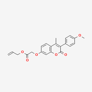 Prop-2-en-1-yl 2-{[3-(4-methoxyphenyl)-4-methyl-2-oxo-2H-chromen-7-yl]oxy}acetate is a synthetic coumarin derivative characterized by a 2H-chromen-2-one core substituted at position 3 with a 4-methoxyphenyl group, at position 4 with a methyl group, and at position 7 with an allyl (prop-2-en-1-yl) ester-linked acetoxy moiety. The compound’s structure combines photostability from the coumarin scaffold with enhanced lipophilicity and reactivity due to the allyl ester group . Its synthesis typically involves coupling reactions between hydrazide intermediates and allyl esters under reflux conditions, as exemplified by protocols yielding similar coumarin-acetamide derivatives .