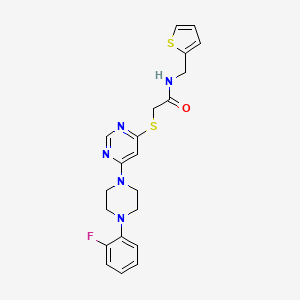 The molecular formula is , with a molecular weight of approximately 437.5 g/mol. The compound's IUPAC name is 2-[6-[4-(2-fluorophenyl)piperazin-1-yl]pyrimidin-4-yl]sulfanyl-N-(thiophen-2-ylmethyl)acetamide.