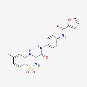 N-(4-(Furan-2-carboxamido)phenyl)-6-methyl-3,4-dihydro-2H-benzo[e][1,2,4]thiadiazine-3-carboxamide 1,1-dioxide is a heterocyclic compound featuring a benzothiadiazine dioxide core substituted with a methyl group at position 6 and a furan-2-carboxamido phenyl moiety.