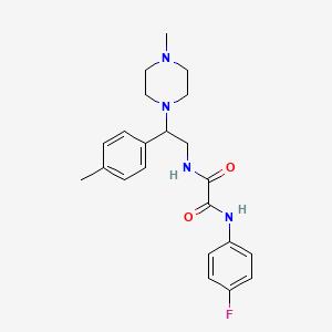 The mechanism of action of N1-(4-fluorophenyl)-N2-(2-(4-methylpiperazin-1-yl)-2-(p-tolyl)ethyl)oxalamide involves its interaction with specific molecular targets, such as enzymes or receptors. The fluorophenyl group may enhance binding affinity to these targets, while the piperazinyl group could modulate the compound’s pharmacokinetic properties. The exact pathways and targets would depend on the specific biological context in which the compound is studied.