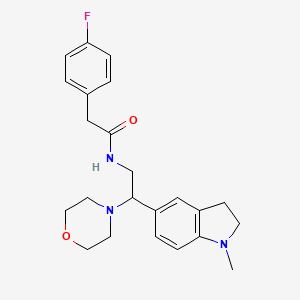 The mechanism of action of 2-(4-fluorophenyl)-N-(2-(1-methylindolin-5-yl)-2-morpholinoethyl)acetamide involves its interaction with specific molecular targets, such as enzymes or receptors. The compound may bind to these targets, modulating their activity and influencing downstream signaling pathways. For instance, it could inhibit an enzyme involved in inflammation, thereby reducing inflammatory responses.