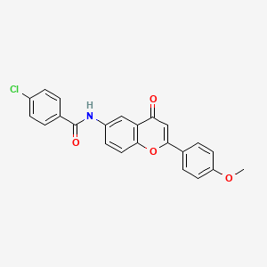 The mechanism of action of 4-chloro-N-[2-(4-methoxyphenyl)-4-oxo-4H-chromen-6-yl]benzamide involves its interaction with specific molecular targets. These targets may include enzymes, receptors, or other proteins that play a role in biological processes. The compound’s effects are mediated through pathways that involve binding to these targets, leading to changes in cellular functions.