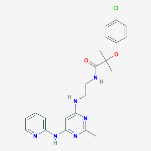 2-(4-Chlorophenoxy)-2-methyl-N-(2-((2-methyl-6-(pyridin-2-ylamino)pyrimidin-4-yl)amino)ethyl)propanamide is a structurally complex molecule featuring a pyrimidine core substituted with methyl, pyridin-2-ylamino, and 4-chlorophenoxy groups, linked via an ethylamino-propanamide chain. Its design integrates substituents known to influence molecular conformation, solubility, and target binding, such as the 4-chlorophenoxy group (enhancing lipophilicity) and the pyridin-2-ylamino moiety (facilitating hydrogen bonding).