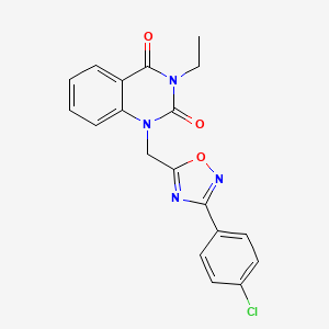 "1-((3-(4-chlorophenyl)-1,2,4-oxadiazol-5-yl)methyl)-3-ethylquinazoline-2,4(1H,3H)-dione" is a heterocyclic compound featuring a quinazoline-2,4-dione core substituted with a 3-ethyl group and a 3-(4-chlorophenyl)-1,2,4-oxadiazole-5-methyl moiety.