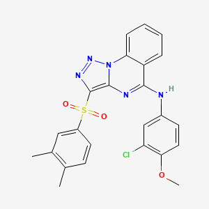 N-(3-Chloro-4-methoxyphenyl)-3-(3,4-dimethylbenzenesulfonyl)-[1,2,3]triazolo[1,5-a]quinazolin-5-amine is a synthetic heterocyclic compound featuring a [1,2,3]triazolo[1,5-a]quinazoline core. This structure is substituted with a 3-chloro-4-methoxyphenyl group at the 5-position and a 3,4-dimethylbenzenesulfonyl moiety at the 3-position.
