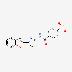 The synthesis of N-(4-(benzofuran-2-yl)thiazol-2-yl)-4-(methylsulfonyl)benzamide typically involves multi-step organic reactions. One common synthetic route includes: