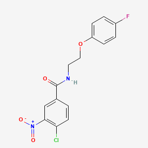 4-Chloro-N-[2-(4-fluorophenoxy)ethyl]-3-nitrobenzamide is a benzamide derivative characterized by a chloro substituent at position 4, a nitro group at position 3 on the benzene ring, and a 2-(4-fluorophenoxy)ethyl side chain on the amide nitrogen. This structure confers unique physicochemical properties, including moderate lipophilicity due to the fluorinated phenoxy group and electronic effects from the nitro and chloro substituents.