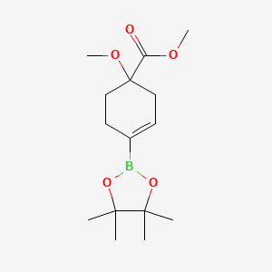The mechanism by which Methyl 1-methoxy-4-(4,4,5,5-tetramethyl-1,3,2-dioxaborolan-2-yl)cyclohex-3-ene-1-carboxylate exerts its effects involves the formation of carbon-carbon bonds through the Suzuki-Miyaura cross-coupling reaction. The boron atom in the compound acts as a Lewis acid, facilitating the formation of a complex with a palladium catalyst. This complex then undergoes transmetalation with an organohalide, followed by reductive elimination to form the desired carbon-carbon bond .
