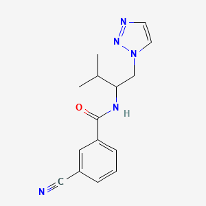 3-cyano-N-(3-methyl-1-(1H-1,2,3-triazol-1-yl)butan-2-yl)benzamide is a benzamide derivative featuring a cyano group at the 3-position of the benzoyl ring and a branched alkyl-triazole side chain. The compound’s structure integrates a 1,2,3-triazole moiety, a heterocycle known for its role in bioorthogonal chemistry and drug design due to its stability and hydrogen-bonding capacity . The side chain comprises a 3-methylbutan-2-yl group linked to the triazole, which may influence lipophilicity and pharmacokinetic properties.